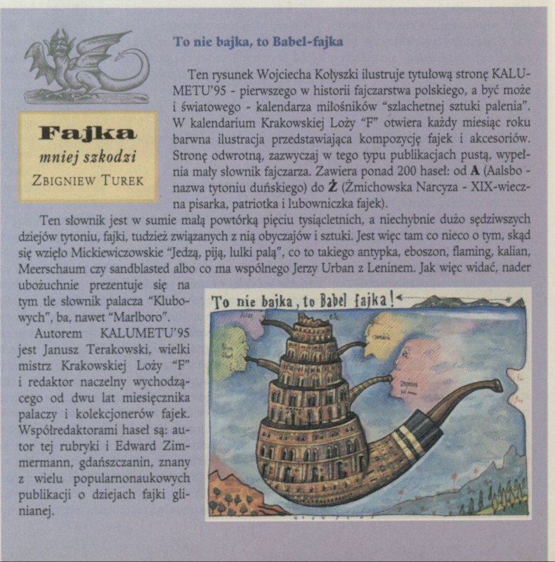 Archiwum / Fajka mniej szkodzi nr specjalny 52/1994 108897/123969 Podziel się Tytuł Fajka mniej szkodzi Autor Zbigniew Turek Rubryka Fajka mniej szkodzi Artykuł z numeru nr specjalny 52/1994 Data wydania 19 grudnia 1994 Tagi KALUMETU'95 Janusz Terakowski