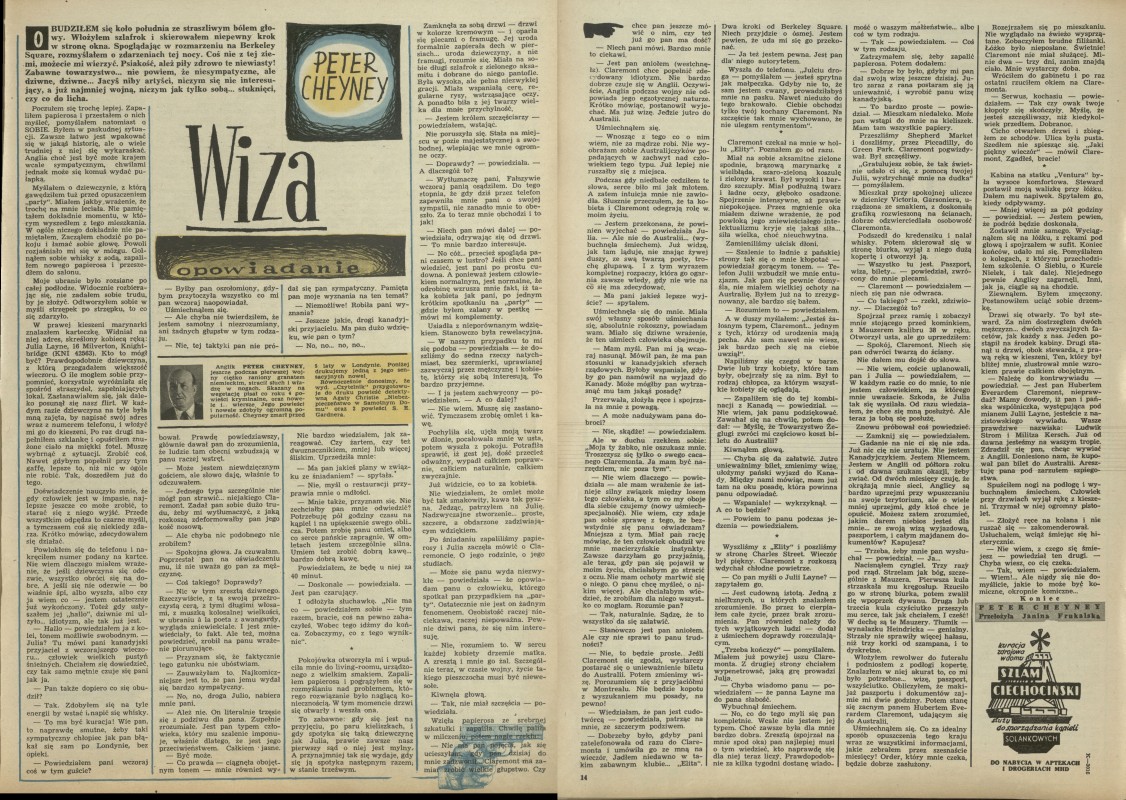 Archiwum / Opowiadanie nr 549 (42/1955) 4/4 Podziel się Tytuł Wiza Autor Peter Cheyney Kategoria Opowiadanie Artykuł z numeru 549 (42/1955) Data wydania 16 października 1955 Tagi nowela sensacyjna literatura angielska