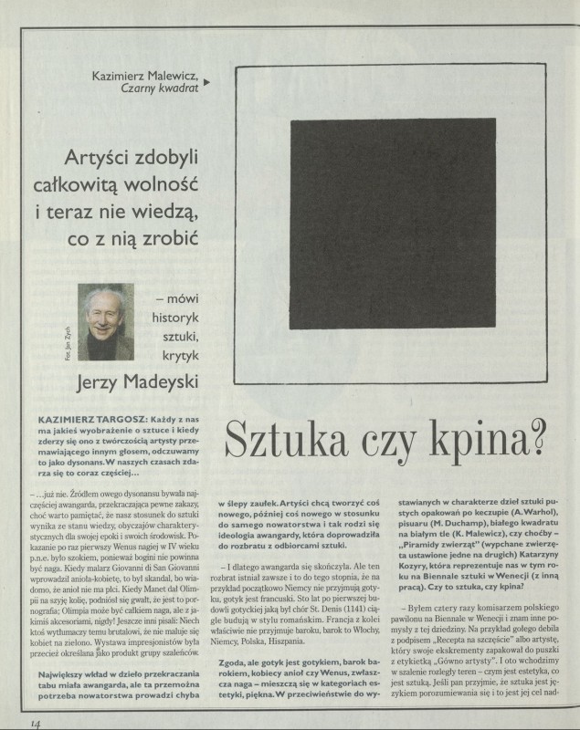 Archiwum / Wywiad nr 2810 (28/1999) 05/276 Podziel się Tytuł Sztuka czy kpina? Autor Kazimierz Targosz Kategoria Wywiad Artykuł z numeru 2810 (2811/1999) Data wydania 2 maja 1999 Tagi Jerzy Madeyski