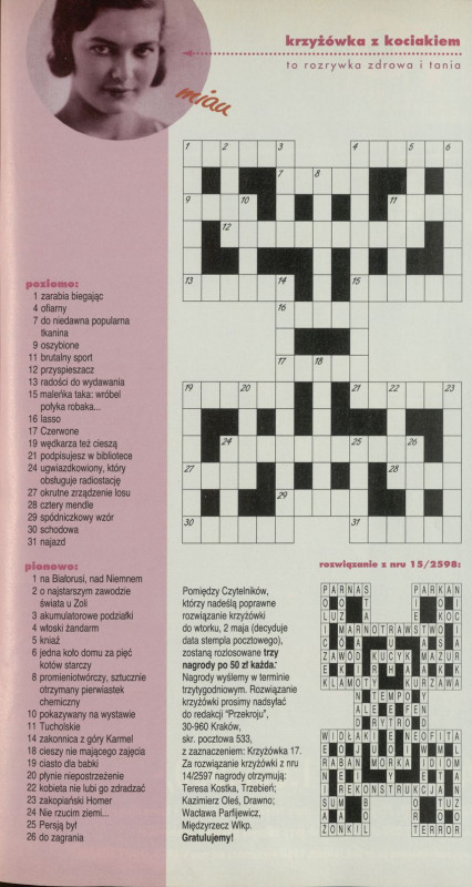 Archiwum / Krzyżówka z kociakiem nr 2600 (17/1995) 37/1678 Podziel się Tytuł Krzyżówka z kociakiem Rubryka Krzyżówka z kociakiem Artykuł z numeru 2600 (17/1995) Data wydania 23 kwietnia 1995