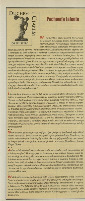 Archiwum / Sport nr 2743 (27/1998) 4/7 Podziel się Tytuł Pochwała talentu Autor Józef Lipiec Rubryka Sport Artykuł z numeru 2743 (2744/1998) Data wydania 18 stycznia 1998