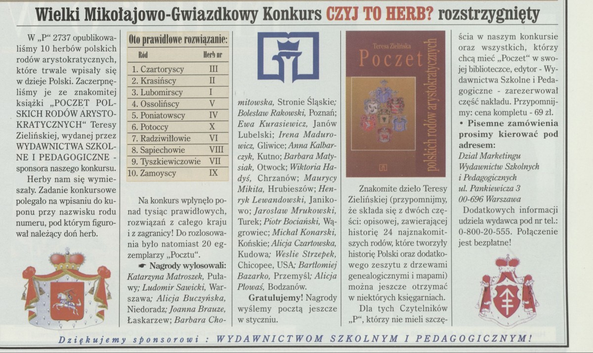Archiwum / Konkurs nr 2743 (27/1998) 117765/123969 Podziel się Tytuł Konkurs Rubryka Konkurs Artykuł z numeru 2743 (2744/1998) Data wydania 18 stycznia 1998 Tagi herb