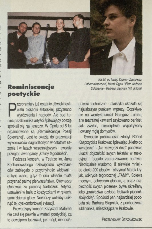 Archiwum / Poezja nr 2631 (48/1995) 1/2 Podziel się Tytuł Reminiscencje poetyckie Autor Przemysław Strzałkowski Kategoria Poezja Artykuł z numeru 2631 (48/1995) Data wydania 26 listopada 1995 Tagi Reminiscencje poezji śpiewanej