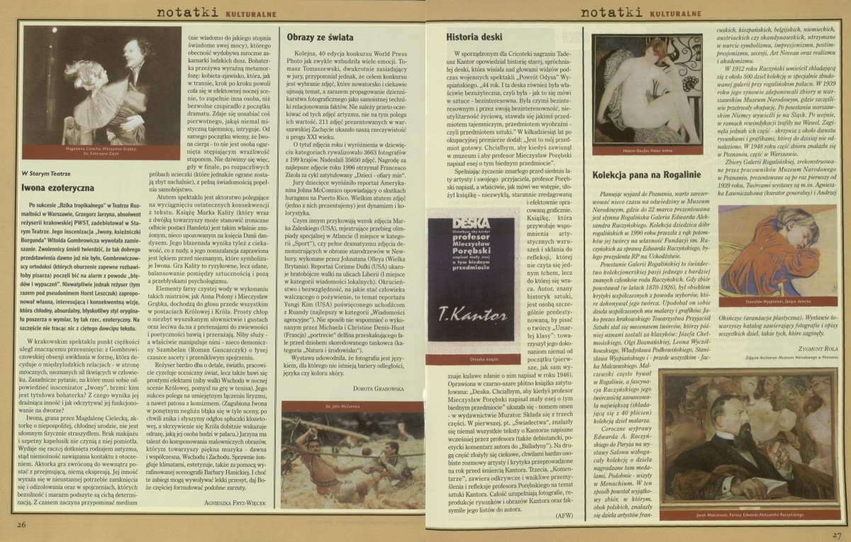 Archiwum / Kultura nr 2744 (27/1998) 117791/123969 Podziel się Tytuł Notatki kulturalne Kategoria Kultura Artykuł z numeru 2744 (2745/1998) Data wydania 25 stycznia 1998 Tagi teatr sztuka