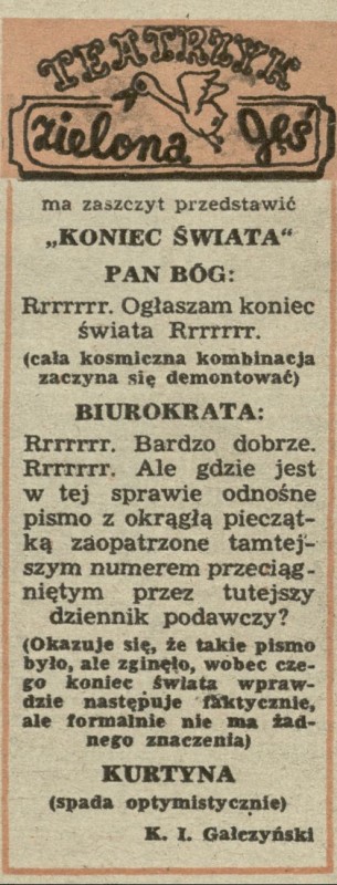 Archiwum / Teatrzyk Zielona Gęś nr 135 (45/1947) 17/113 Podziel się Tytuł Koniec Świata Autor Konstanty Ildefons Gałczyński Rubryka Teatrzyk Zielona Gęś Artykuł z numeru 135 (45/1947) Data wydania 9 listopada 1947 Tagi groteska humor scenka rodzajowa gag