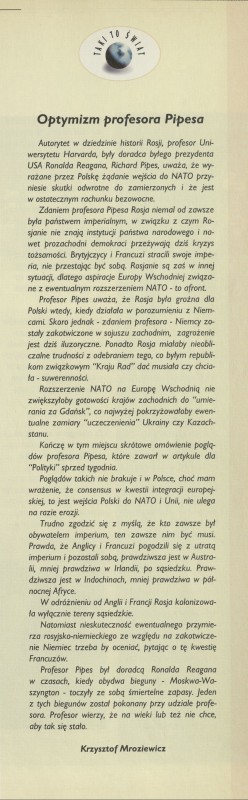 Archiwum / Komentarz nr 2602 (19/1995) 109986/123969 Podziel się Tytuł Taki to świat: Optymizm profesora Pipesa Autor Krzysztof Mroziewicz Kategoria Komentarz Artykuł z numeru 2602 (19/1995) Data wydania 7 maja 1995