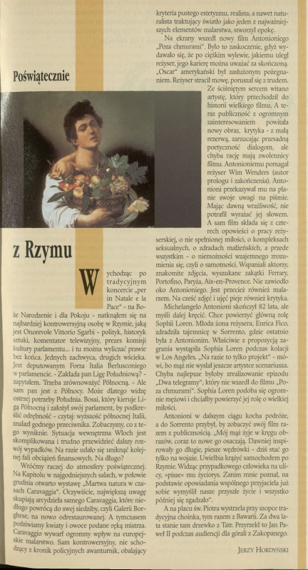 Archiwum / korespondencja własna "Przekroju" nr 2639 (03/1996) 05/79 Podziel się Tytuł Poświątecznie z Rzymu Autor Jerzy Hordyński Rubryka korespondencja własna "Przekroju" Artykuł z numeru 2639 (3/1996) Data wydania 21 stycznia 1996 Tagi Święta Bożego Narodzenia Loren Antonioni