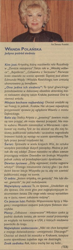 Archiwum / Społeczeństwo nr specjalny 34/1996 78/113 Podziel się Tytuł Wanda Polańska. Jedyna pośród siedmiu Autor teb Kategoria Społeczeństwo Artykuł z numeru nr specjalny 34/1996 Data wydania 25 sierpnia 1996 Tagi aktorka operetka pytania