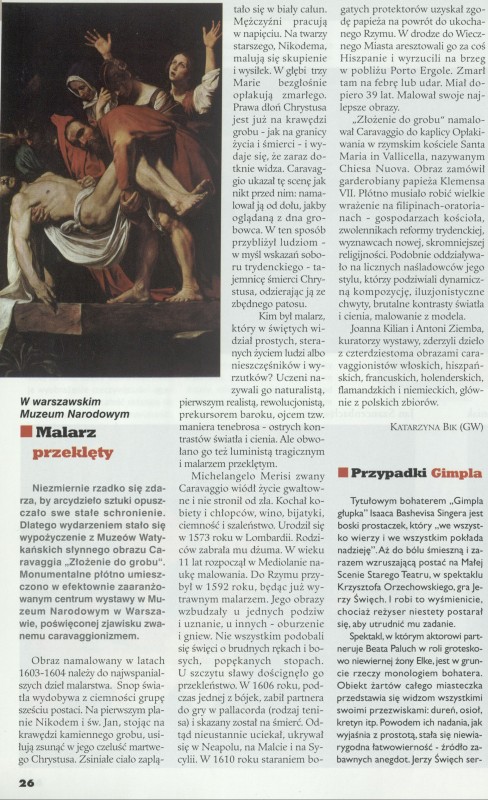 Archiwum / Artykuł nr 2678 (42/1996) 5/5 Podziel się Tytuł Malarz przeklęty Autor Katarzyna Bik Kategoria Artykuł Artykuł z numeru 2678 (42/1996) Data wydania 20 października 1996 Tagi Caravaggio