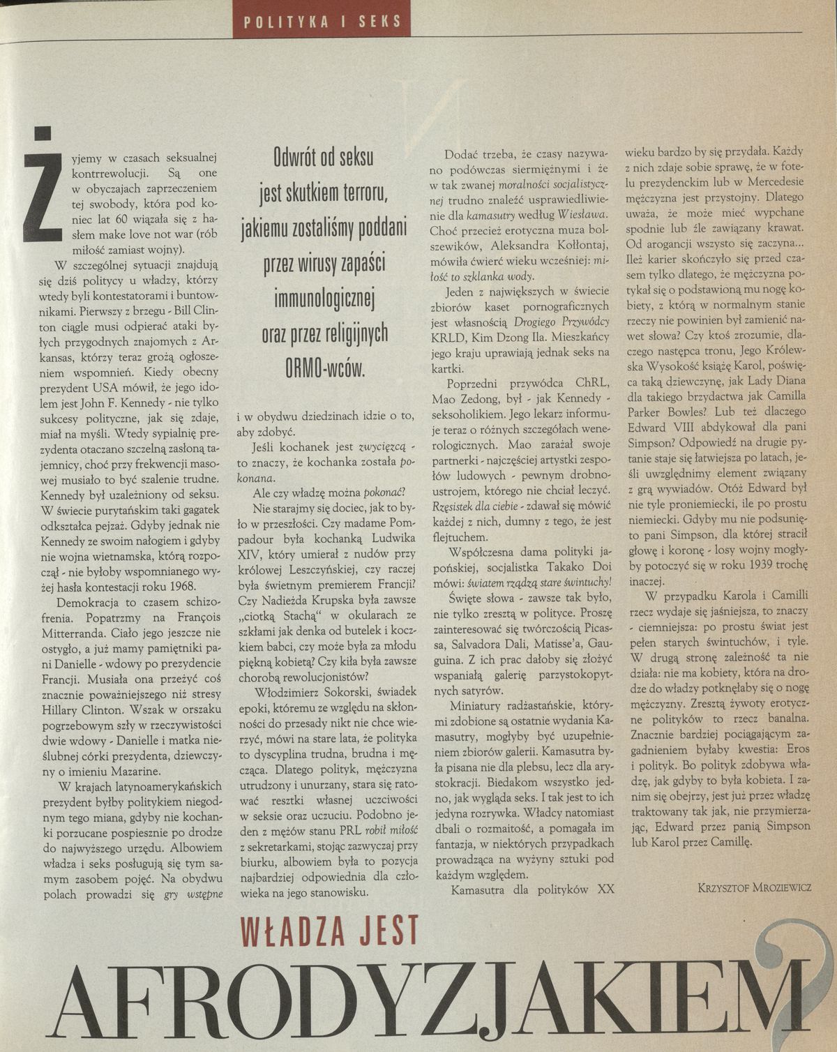 Archiwum / Artykuł nr 2650 (14/1996) 29/113 Podziel się Tytuł Władza jest afrodyzjakiem Autor Krzysztof Mroziewicz Kategoria Artykuł Artykuł z numeru 2650 (14/1996) Data wydania 7 kwietnia 1996