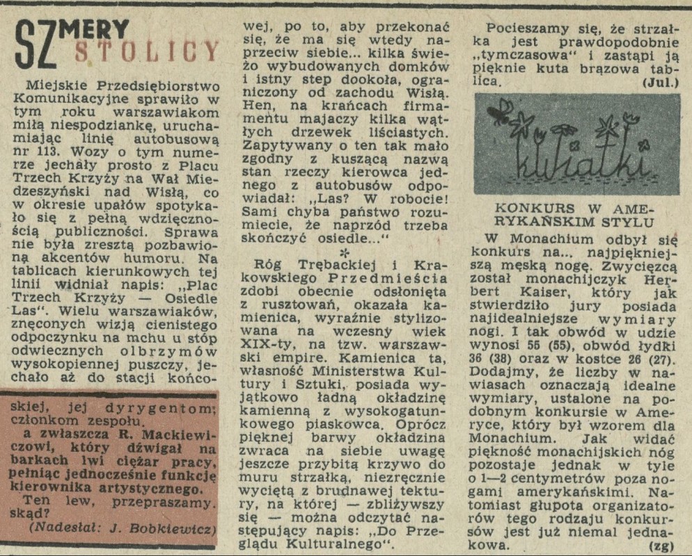 Archiwum / Szmery nr 433 (30/1953) 27/230 Podziel się Tytuł Szmery Stolicy Autor Jul. Rubryka Szmery Artykuł z numeru 433 (30/1953) Data wydania 26 lipca 1953 Tagi Miejskie Przedsiębiorstwo Komunikacyjne Plac Trzech Krzyży Krakowskie Przedmieście