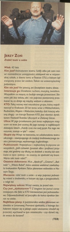 Archiwum / Teatr nr specjalny 36/1996 87/138 Podziel się Tytuł Jerzy Zoń. Zrobić teatr o sobie Autor teb Rubryka Teatr Artykuł z numeru nr specjalny 36/1996 Data wydania 9 sierpnia 1996 Tagi animator teatru pytania