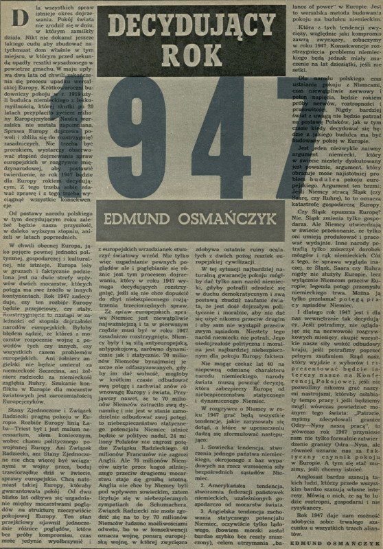 Archiwum / Społeczeństwo nr 91 (01/1947) 03/1638 Podziel się Tytuł Decydujący rok 1947 Autor Edmund Osmańczyk Kategoria Społeczeństwo Artykuł z numeru 91 (1/1947) Data wydania 5 stycznia 1947 Tagi Europa II Wojna Światowa