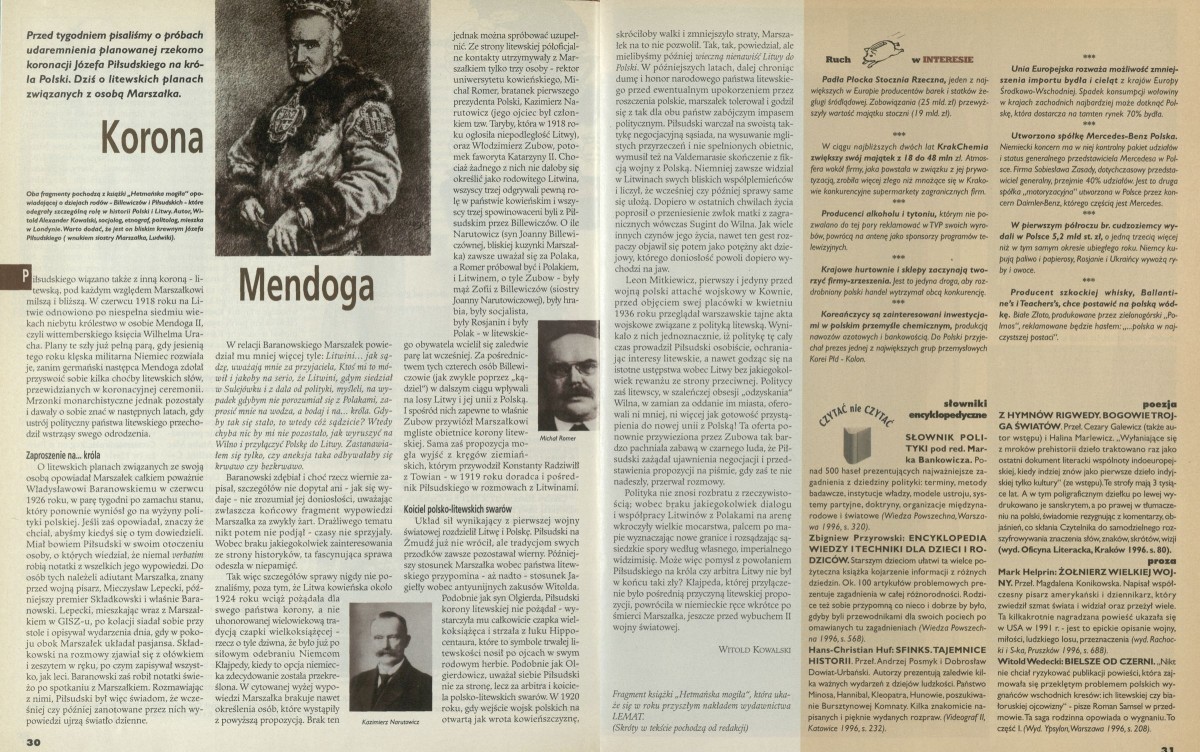 Archiwum / Artykuł nr 2682 (46/1996) 17/17 Podziel się Tytuł Korona Mendoga Autor Witold Kowalski Kategoria Artykuł Artykuł z numeru 2682 (46/1996) Data wydania 17 listopada 1996