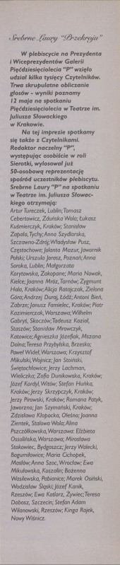 Archiwum / Kultura nr 2603 (20/1995) 40/98 Podziel się Tytuł Srebrne Laury „Przekroju” Kategoria Kultura Artykuł z numeru 2603 (20/1995) Data wydania 14 maja 1995