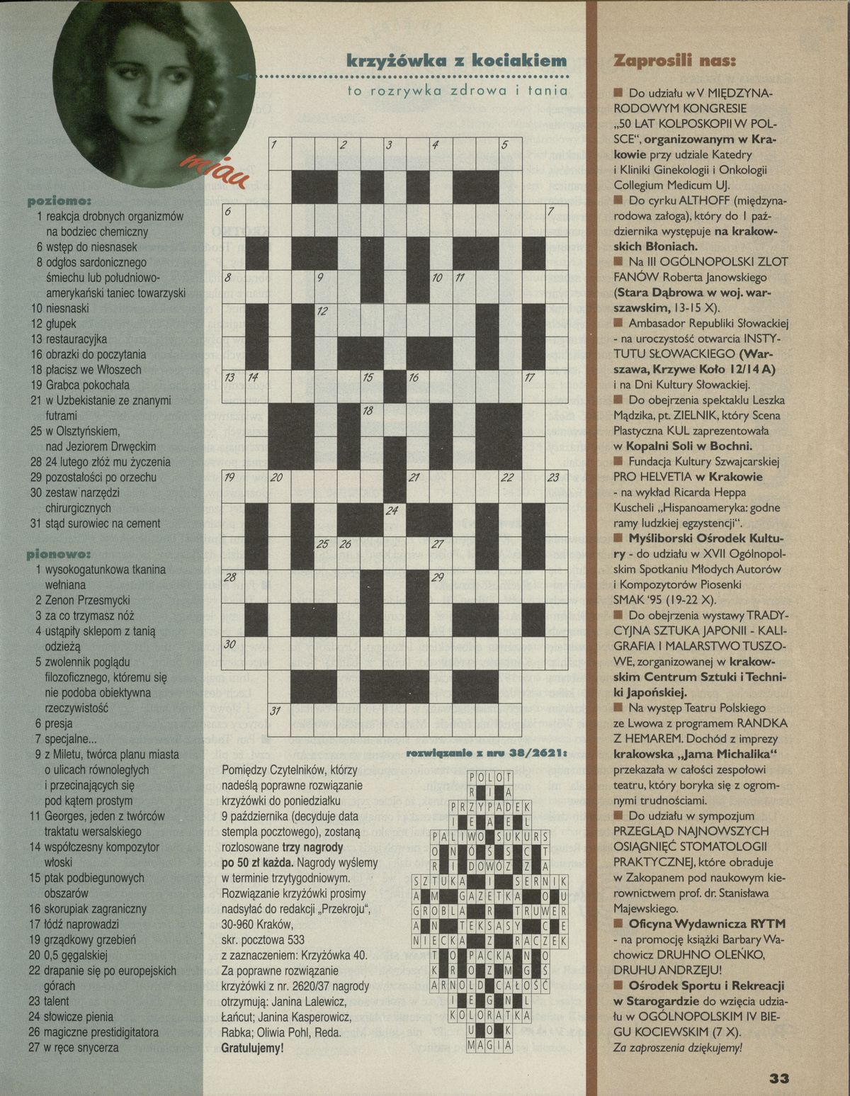 Archiwum / Krzyżówka z kociakiem nr 2623 (40/1995) 1657/1671 Podziel się Tytuł krzyzówka z kociakiem Rubryka Krzyżówka z kociakiem Artykuł z numeru 2623 (40/1995) Data wydania 1 października 1995