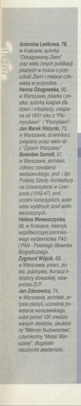 Archiwum / Przekrój tygodnia nr 2603 (20/1995) 3/5 Podziel się Tytuł Zmarli Rubryka Przekrój tygodnia Artykuł z numeru 2603 (20/1995) Data wydania 14 maja 1995 Tagi Hanna Ożogowska Helena Wereszczycka Jan Zdanowicz