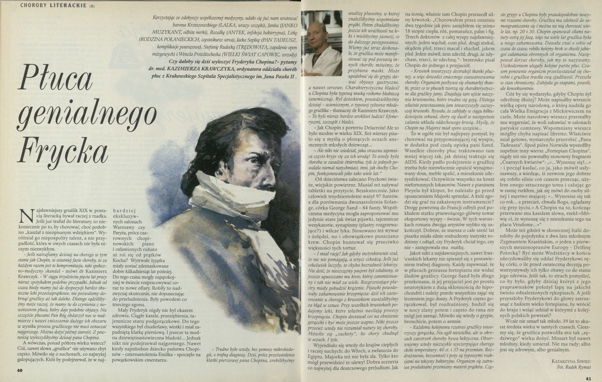 Archiwum / Artykuł nr 2693 (05/1997) 114881/123969 Podziel się Tytuł Płuca genialnego Frycka Autor Katarzyna Siwiec Kategoria Artykuł Artykuł z numeru 2693 (5/1997) Data wydania 2 lutego 1997 Tagi Fryderyk Chopin