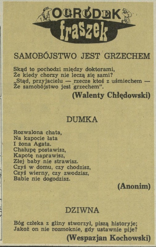 Archiwum / Rozmaitości [old] nr 2321-23 (49-51/1989) 30/30 Podziel się Tytuł Ogródek fraszek Autor Wespazjan Kochowski Rubryka Rozmaitości [old] Artykuł z numeru 2321-23 (49/1989) Data wydania 17 grudnia 1989