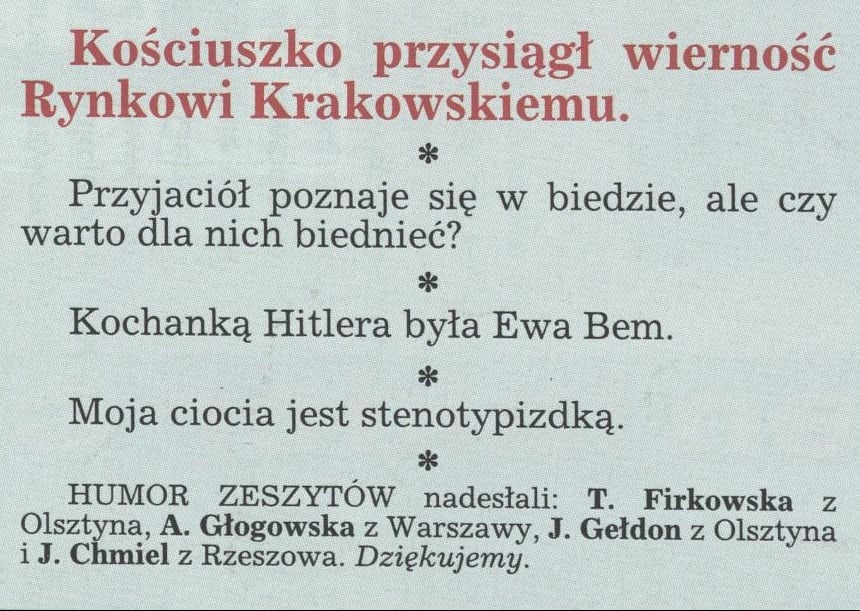 Archiwum / Humor zeszytów szkolnych nr 2656 (20/1996) 53/137 Podziel się Tytuł Humor zeszytów Rubryka Humor zeszytów szkolnych Artykuł z numeru 2656 (20/1996) Data wydania 19 maja 1996 Tagi powiedzonka