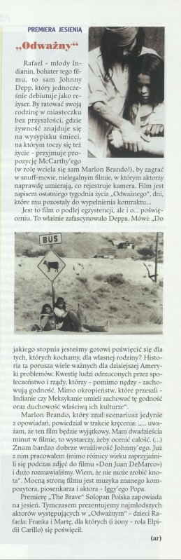 Archiwum / Recenzja nr 2721 (33/1997) 286/298 Podziel się Tytuł Premiera jesienią „Odważny” Autor AR Kategoria Recenzja Artykuł z numeru 2721 (33/1997) Data wydania 17 sierpnia 1997 Tagi Johnny Depp Marlon Brando Iggy Pop