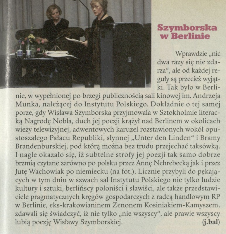 Archiwum / Różności nr specjalny 3/1997 29/403 Podziel się Tytuł Szymborska w Berlinie Autor j.bal Kategoria Różności Artykuł z numeru nr specjalny 3/1997 Data wydania 19 stycznia 1997 Tagi Wisława Szymborska Berlin Instytut Polski
