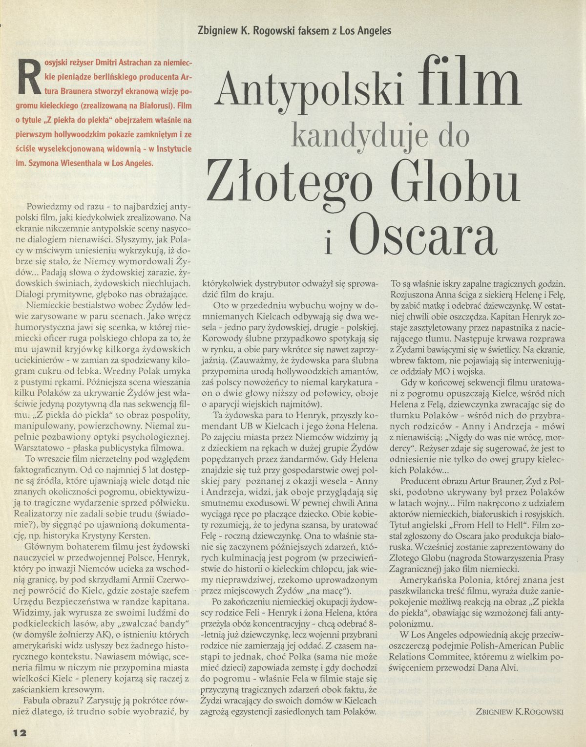 Archiwum / Film nr 2689 (01/1997) 01/102 Podziel się Tytuł Antypolski film kandyduje do Złotego Globu i Oscara Autor Zbigniew K. Rogowski Rubryka Film Artykuł z numeru 2689 (1/1997) Data wydania 5 stycznia 1997 Tagi los angeles dmitri astrachan artur brauner