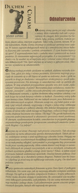Archiwum / Sport nr specjalny 3/1997 114773/123969 Podziel się Tytuł Duchem i ciałem. Odnaturzenie Autor Józef Lipiec Kategoria Sport Artykuł z numeru nr specjalny 3/1997 Data wydania 19 stycznia 1997 Tagi sport kontakt z naturą