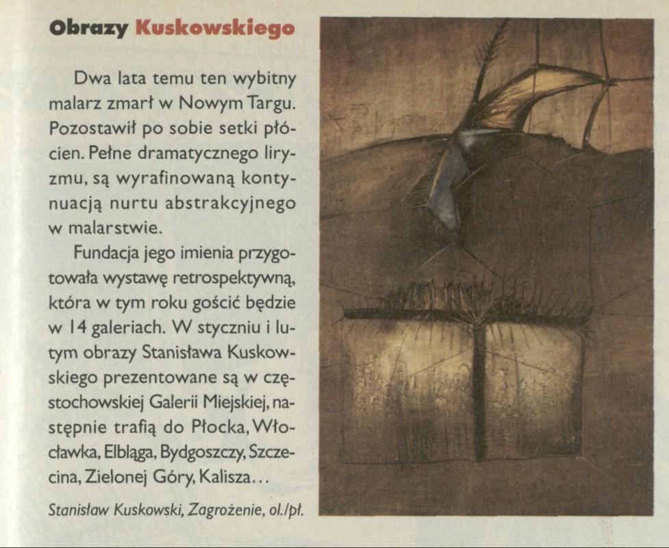 Archiwum / Kultura nr 2692 (04/1997) 40/619 Podziel się Tytuł Obrazy Kuskowskiego Kategoria Kultura Artykuł z numeru 2692 (4/1997) Data wydania 30 stycznia 1997 Tagi Stanisław Kuskowski zagrożenie