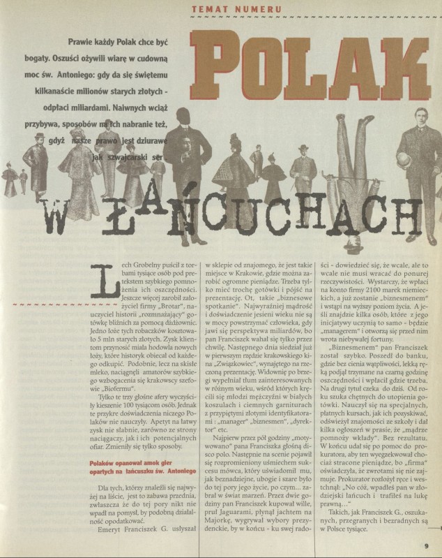Archiwum / Artykuł nr 2696 (08/1997) 73/353 Podziel się Tytuł Polak w łańcuchach Autor Lucyna Zienkiewicz-Kurek Kategoria Artykuł Artykuł z numeru 2696 (8/1997) Data wydania 23 lutego 1997 Tagi bogactwo