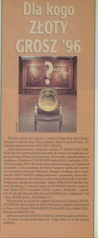 Archiwum nr 2696 (08/1997) 115011/123969 Podziel się Tytuł Dla kogo Złoty Grosz '96 Artykuł z numeru 2696 (8/1997) Data wydania 23 lutego 1997 Tagi laureaci