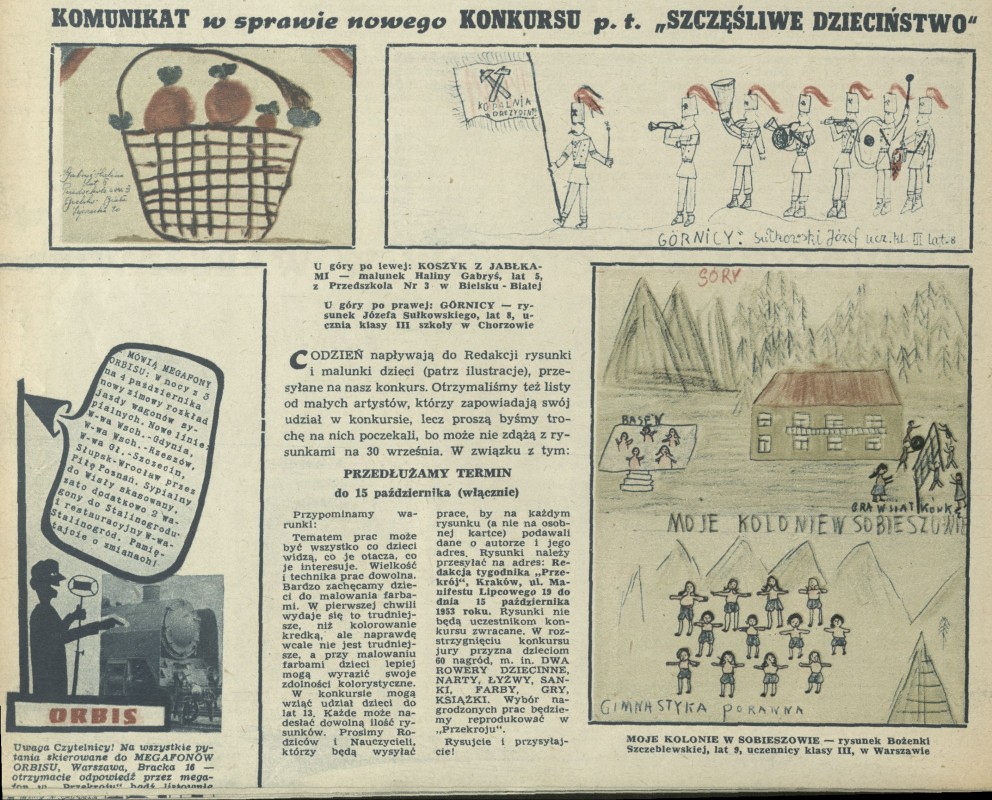 Archiwum / Konkurs nr 442 (39/1953) 15948/123969 Podziel się Tytuł Komunikat w sprawie konkursu pt. „Szczęśliwe dzieciństwo” Rubryka Konkurs Artykuł z numeru 442 (39/1953) Data wydania 27 września 1953 Tagi rysunki dziecięce dzieci