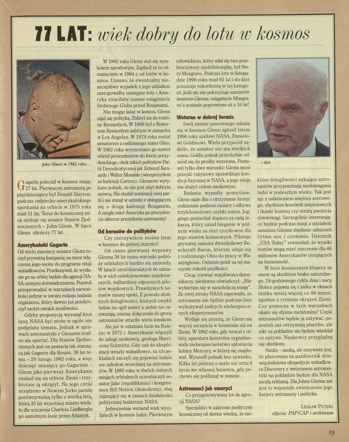 Archiwum / Artykuł nr 2750 (27/1998) 64/114 Podziel się Tytuł 77 lat wiek dobry do lotu w kosmos Autor Lesław Peters Kategoria Artykuł Artykuł z numeru 2750 (2751/1998) Data wydania 8 marca 1998 Tagi kosmos Glenn