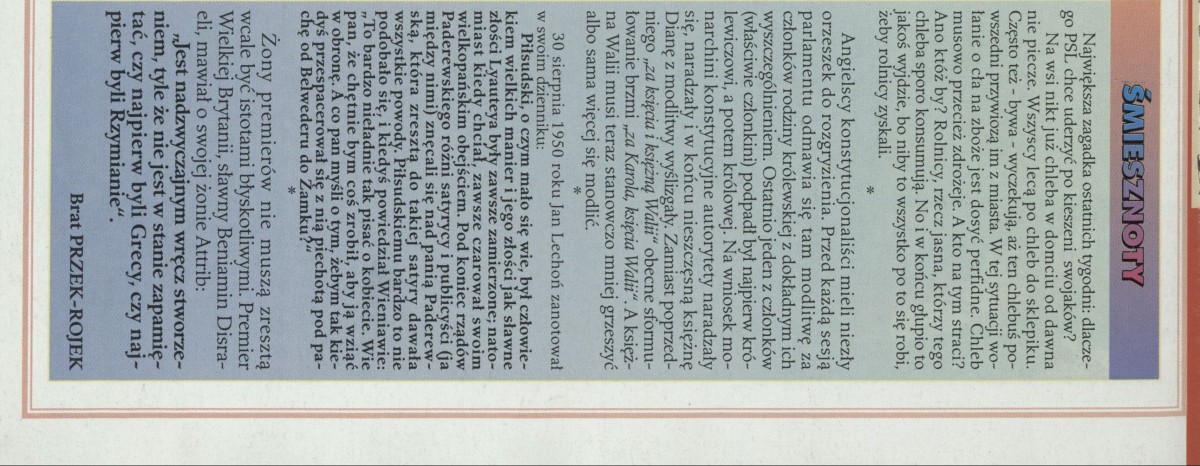 Archiwum nr 2696 (08/1997) 1327/1341 Podziel się Tytuł Śmiesznoty Autor Brat PRZEK-ROJEK Artykuł z numeru 2696 (8/1997) Data wydania 23 lutego 1997 Tagi zagadka