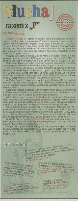 Archiwum / Reklamy nr 2755 (27/1998) 70/423 Podziel się Tytuł Słuchaj razem z „P”. Wielanoc w eterze Rubryka Reklamy Artykuł z numeru 2755 (2756/1998) Data wydania 12 kwietnia 1998 Tagi Polskie Radio