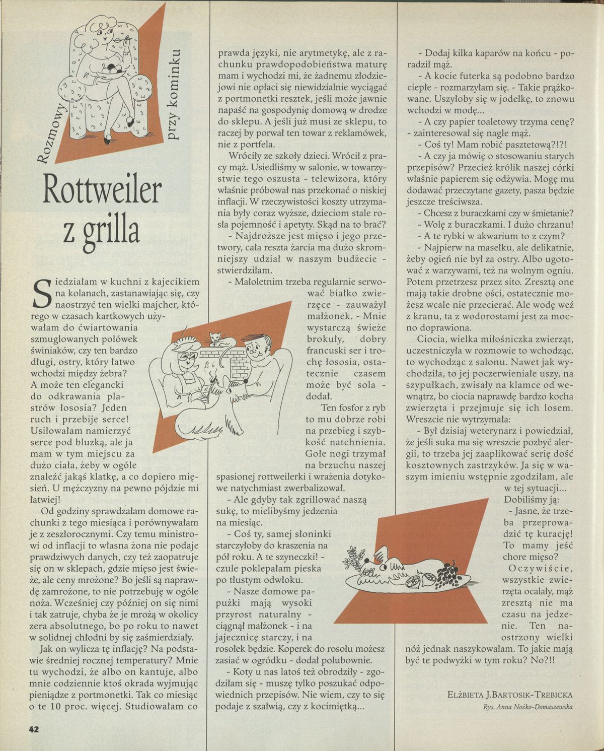 Archiwum / Felieton nr specjalny 11/1997 36/190 Podziel się Tytuł Rottweiler z grilla Autor Elżbieta J. Bartosik-Trebicka Kategoria Felieton Artykuł z numeru nr specjalny 11/1997 Data wydania 16 marca 1997 Tagi kuchnia przepis pies