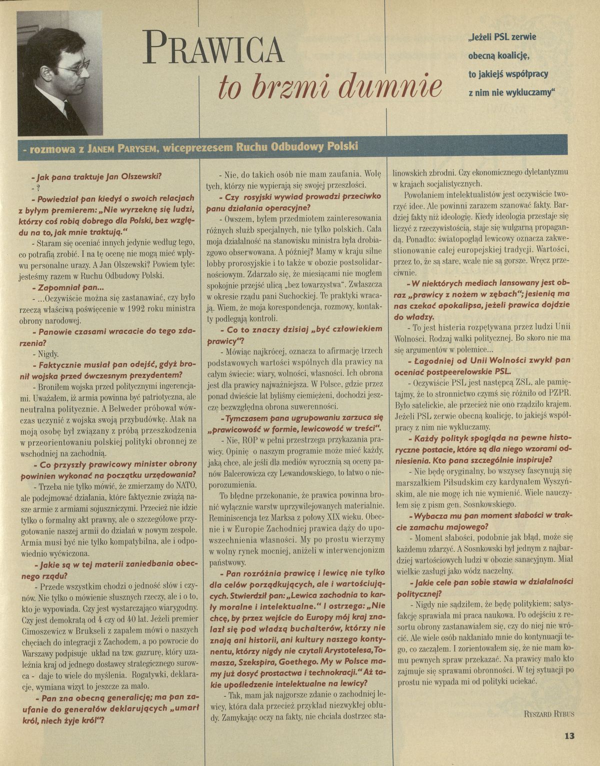 Archiwum / Wywiad nr specjalny 15/1997 115431/123969 Podziel się Tytuł Prawica to brzmi dumnie Autor Ryszard Rybus Kategoria Wywiad Artykuł z numeru nr specjalny 15/1997 Data wydania 13 kwietnia 1997 Tagi Ruch Odbudowy Polski wywiad Jan Parys
