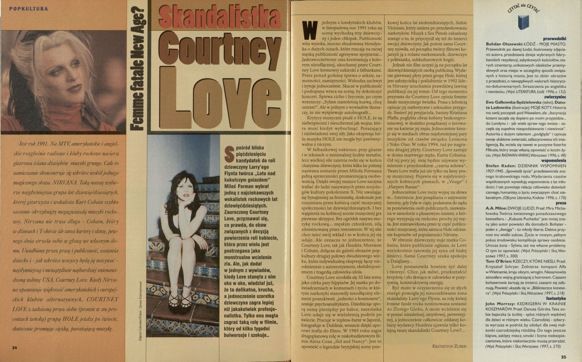 Archiwum / Artykuł nr specjalny 15/1997 3/3 Podziel się Tytuł Femme fatale New Age? Skandalistka Courtney Love Autor Krzysztof Żurek Kategoria Artykuł Artykuł z numeru nr specjalny 15/1997 Data wydania 13 kwietnia 1997 Tagi Courtney Love popkultura skandale