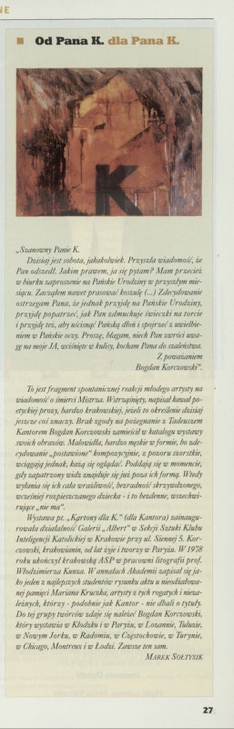 Archiwum / Relacja nr 2710 (22/1997) 1/1 Podziel się Tytuł Od Pana K. dka Pana K. Autor Marek Sołtysik Kategoria Relacja Artykuł z numeru 2710 (22/1997) Data wydania 1 czerwca 1997 Tagi Kantor