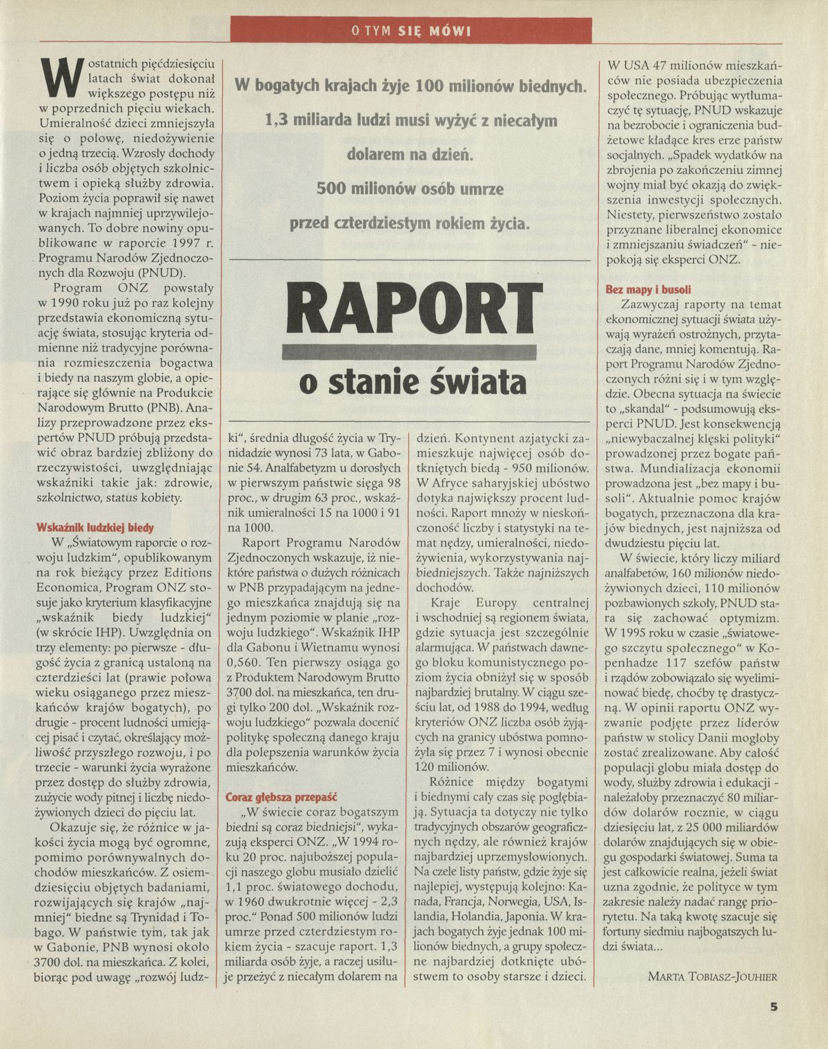 Archiwum / Artykuł nr 2716 (28/1997) 10/15 Podziel się Tytuł O tym się mówi Autor Tobiasz Marta Kategoria Artykuł Artykuł z numeru 2716 (28/1997) Data wydania 13 lipca 1997 Tagi raport o stanie świata onz