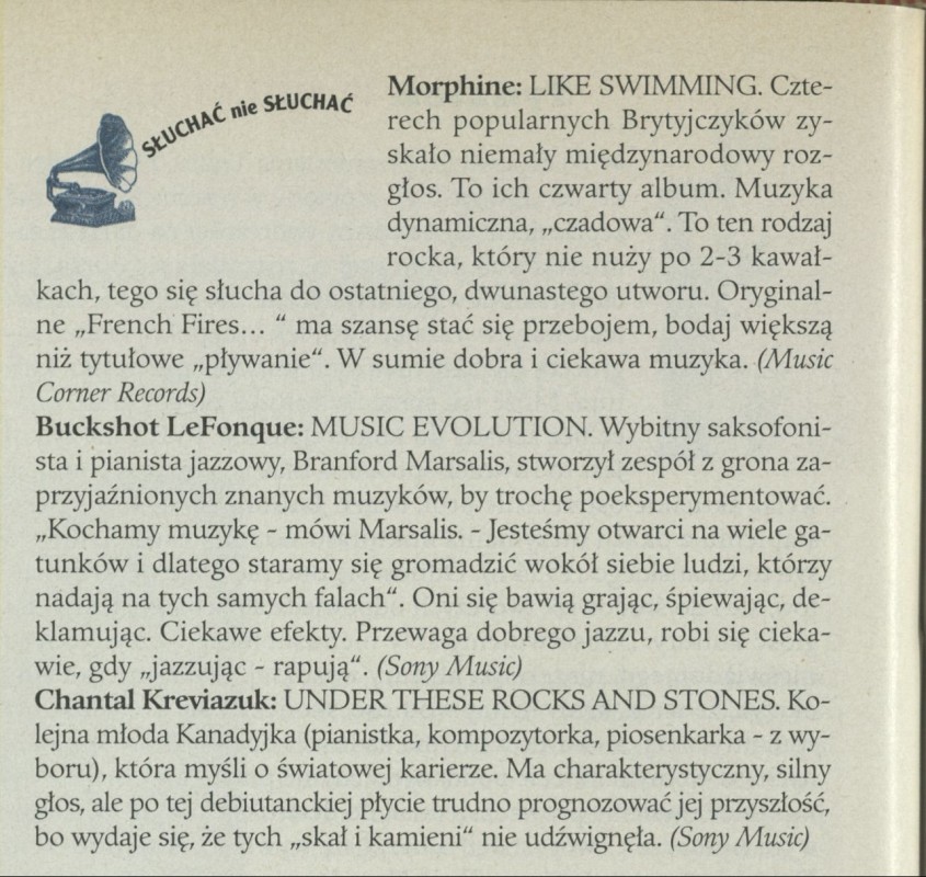 Archiwum / Słuchać albo nie słuchać nr specjalny 17/1997 1/1 Podziel się Tytuł Słuchać albo nie słuchać Rubryka Słuchać albo nie słuchać Artykuł z numeru nr specjalny 17/1997 Data wydania 27 kwietnia 1997 Tagi muzyka Morphine LeFonque Kreviazuk