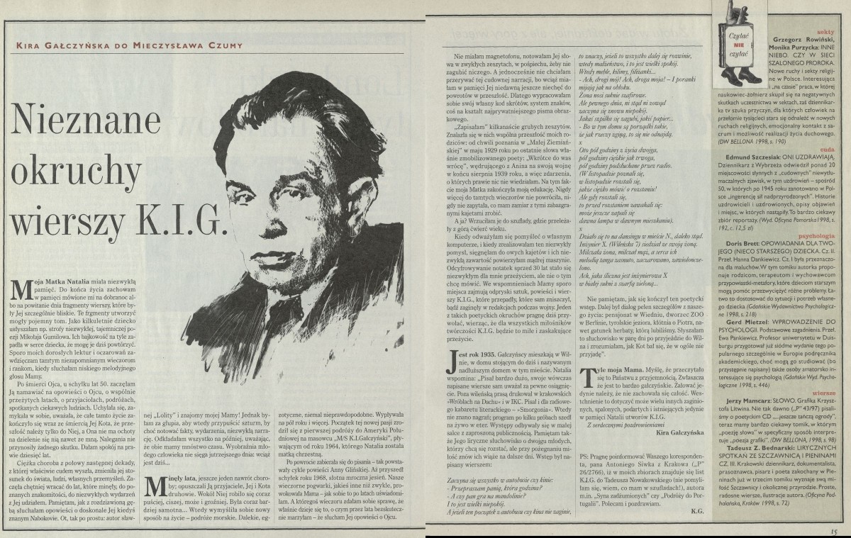 Archiwum / Relacja nr 2776 (27/1998) 21/114 Podziel się Tytuł Nieznane okruchy wiersz K.I.G Autor Kira Gałczyńska Kategoria Relacja Artykuł z numeru 2776 (2777/1998) Data wydania 6 września 1998