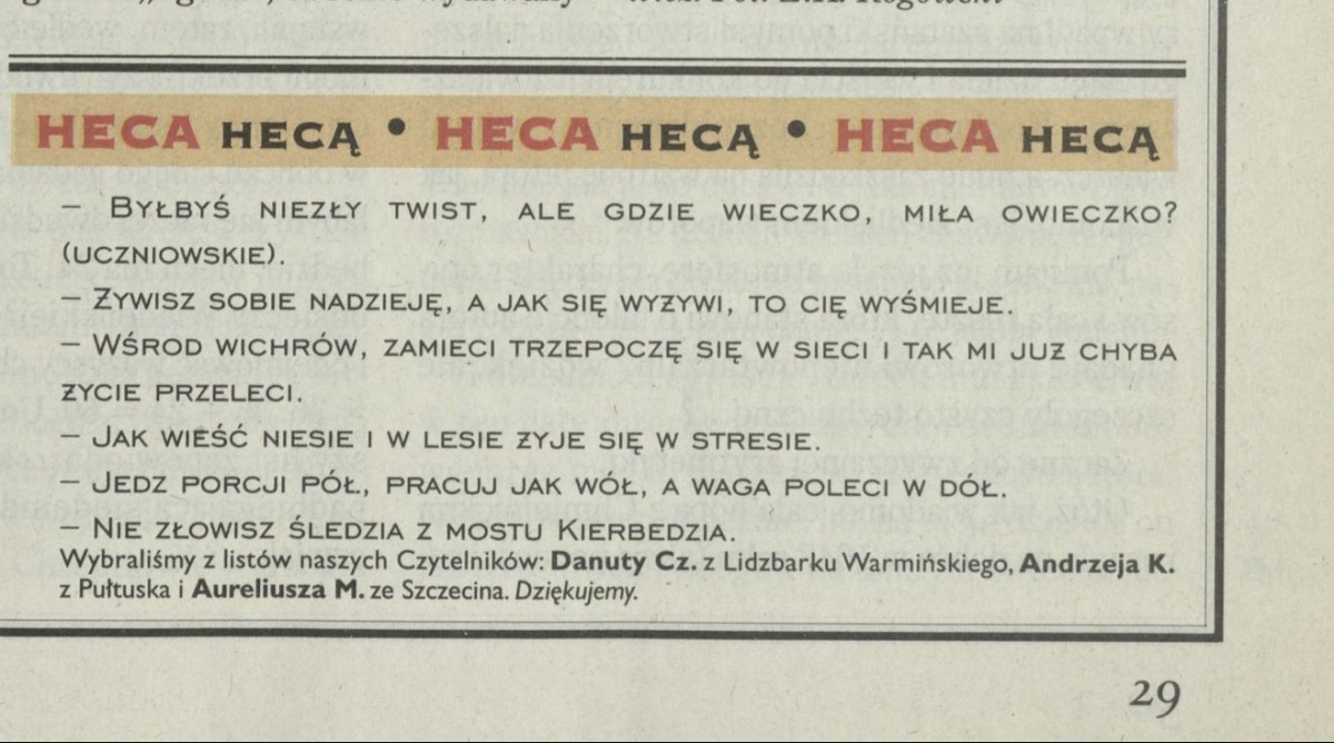 Archiwum / Heca hecą nr 2762 (27/1998) 1233/1313 Podziel się Tytuł Heca hecą Rubryka Heca hecą Artykuł z numeru 2762 (2763/1998) Data wydania 31 maja 1998 Tagi heca hecą rozrywka