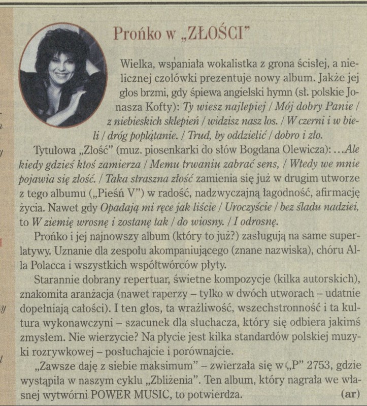 Archiwum / Recenzja nr 2755 (27/1998) 03/15 Podziel się Tytuł Prońko w „Złości” Autor AR Kategoria Recenzja Artykuł z numeru 2755 (2756/1998) Data wydania 12 kwietnia 1998 Tagi muzyka
