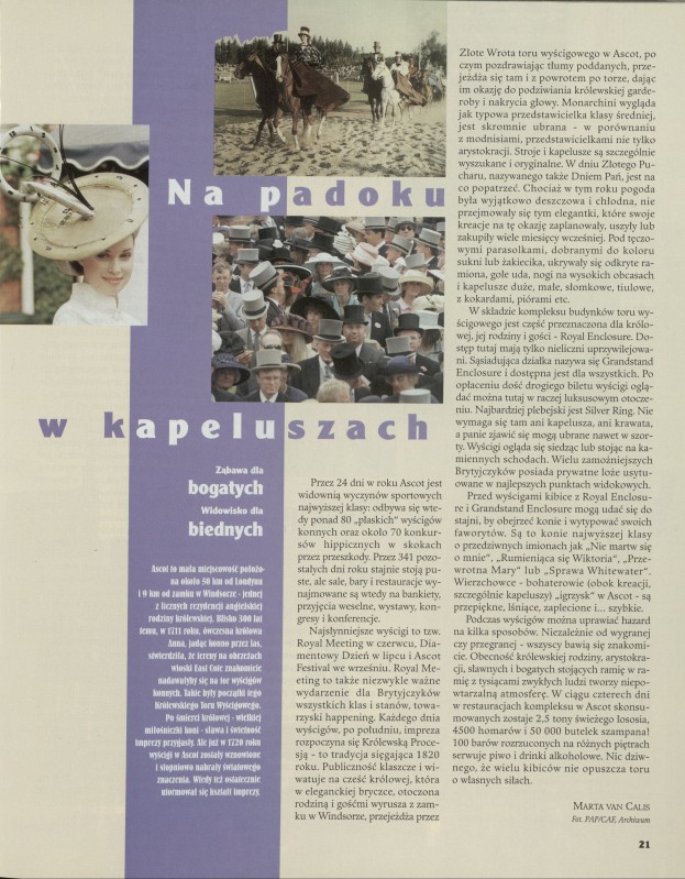 Archiwum / Relacja nr 2719 (31/1997) 116395/123969 Podziel się Tytuł Na padoku w kapeluszach. Zabawa dla bogatych, widowisko dla biednych Autor Marta van Calis Kategoria Relacja Artykuł z numeru 2719 (31/1997) Data wydania 3 sierpnia 1997 Tagi Ascot wyścigi konne