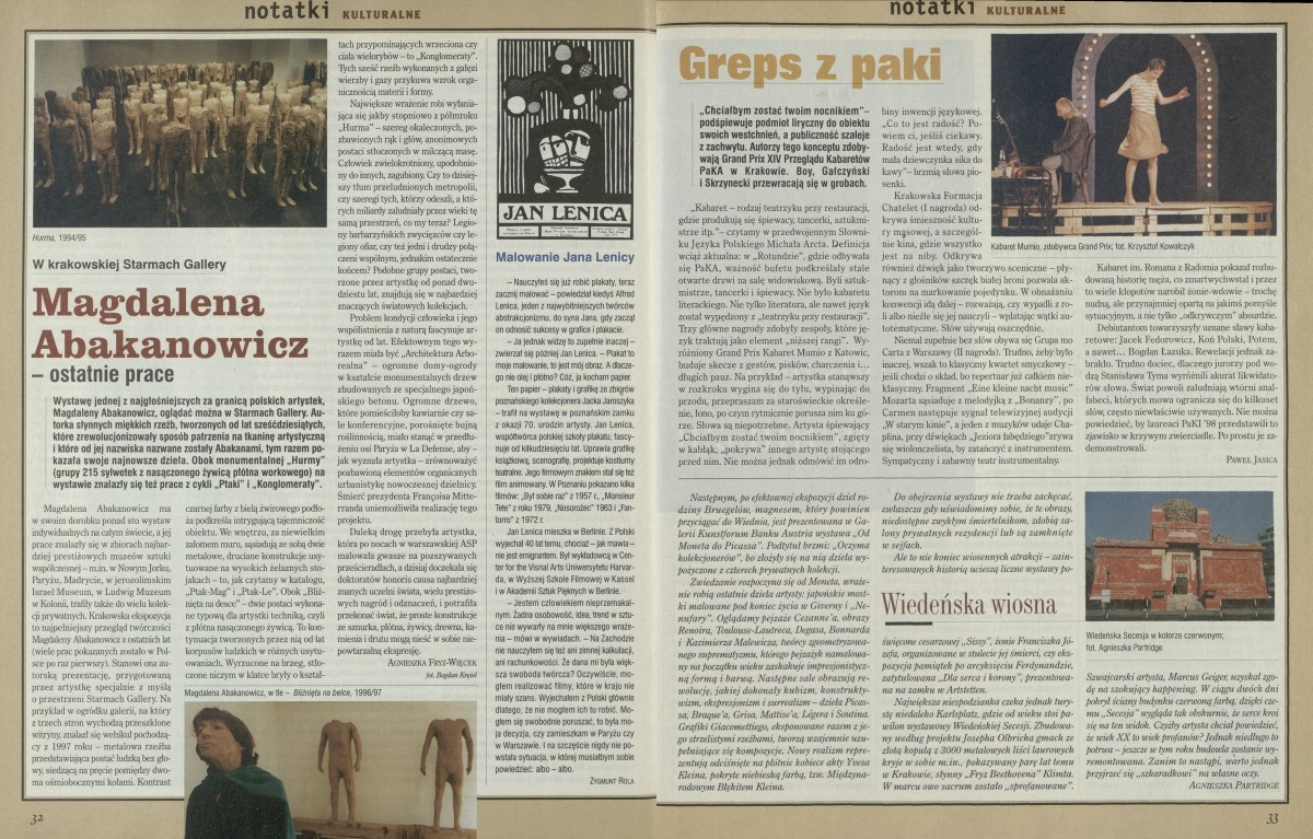 Archiwum / Kultura nr specjalny 2762/1998 118720/123969 Podziel się Tytuł Notatki kulturalne Autor Agnieszka Fryz-Więcek, Zygmunt Rola Kategoria Kultura Artykuł z numeru nr specjalny 2762/1998 Data wydania 24 maja 1998 Tagi kultura Magdalena Abakanowicz