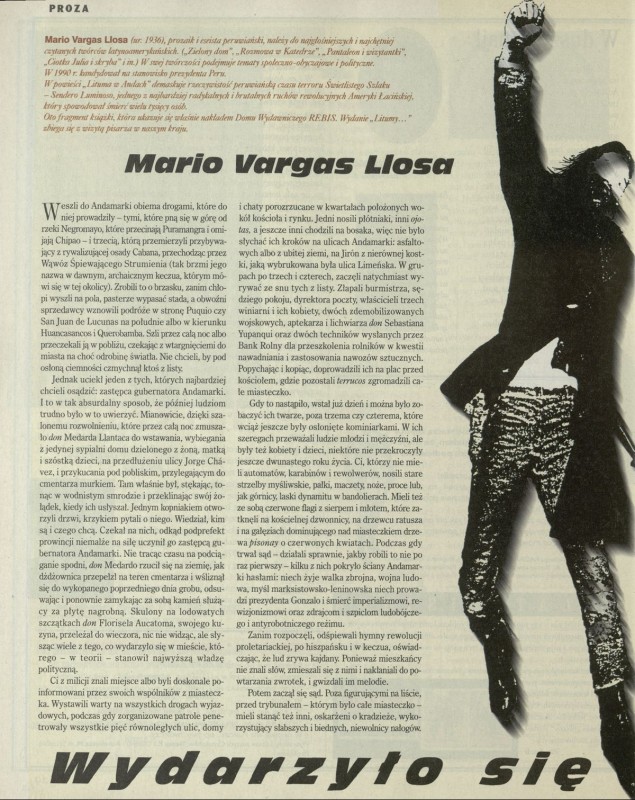 Archiwum / Proza nr 2760 (27/1998) 118655/123969 Podziel się Tytuł Wydarzyło się w Andamarce Autor Mario Vargas Llosa Kategoria Proza Artykuł z numeru 2760 (2761/1998) Data wydania 17 maja 1998