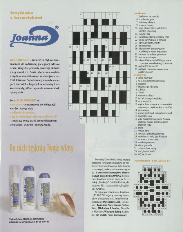 Archiwum / Krzyżówka nr 2719 (31/1997) 107/174 Podziel się Tytuł Krzyżówka z kosmetykami Rubryka Krzyżówka Artykuł z numeru 2719 (31/1997) Data wydania 3 sierpnia 1997 Tagi rozrywka zdrowa i tania