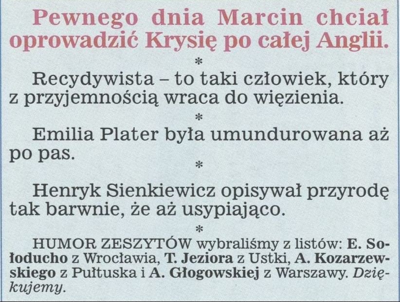Archiwum / Humor zeszytów szkolnych nr 2773 (27/1998) 22/62 Podziel się Tytuł Humor zeszytów Rubryka Humor zeszytów szkolnych Artykuł z numeru 2773 (2774/1998) Data wydania 16 sierpnia 1998 Tagi humor zeszytów szkoła wypracowania