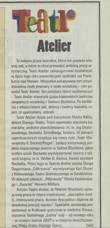 Archiwum / Teatr nr 2778 (27/1998) 29/31 Podziel się Tytuł Teatr Atelier Autor tak Rubryka Teatr Artykuł z numeru 2778 (2779/1998) Data wydania 20 grudnia 1998 Tagi Teatr Atelier Peter Brook